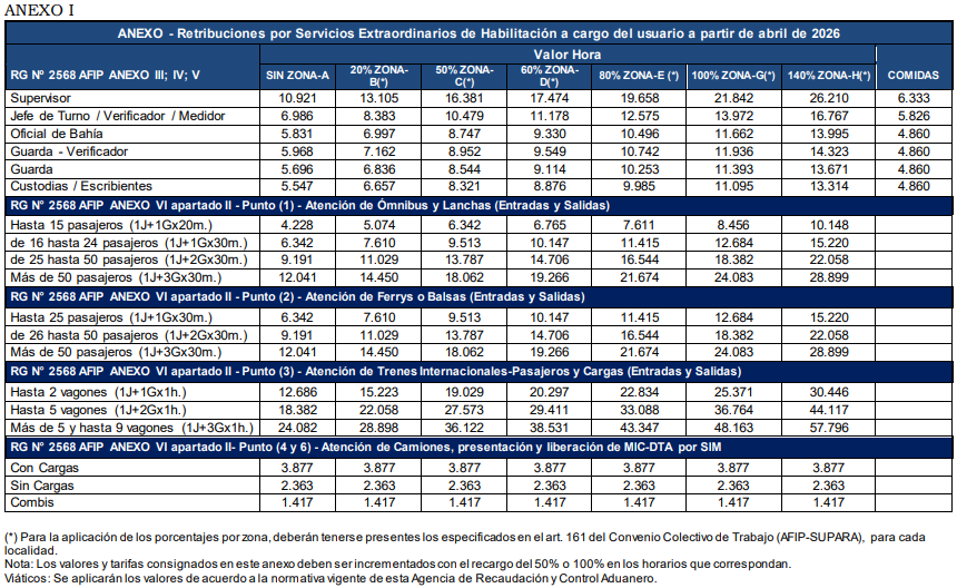 Servicios Extraordinarios: Nuevo cuadro tarifario vigente a partir de HOY (20/04/2026)