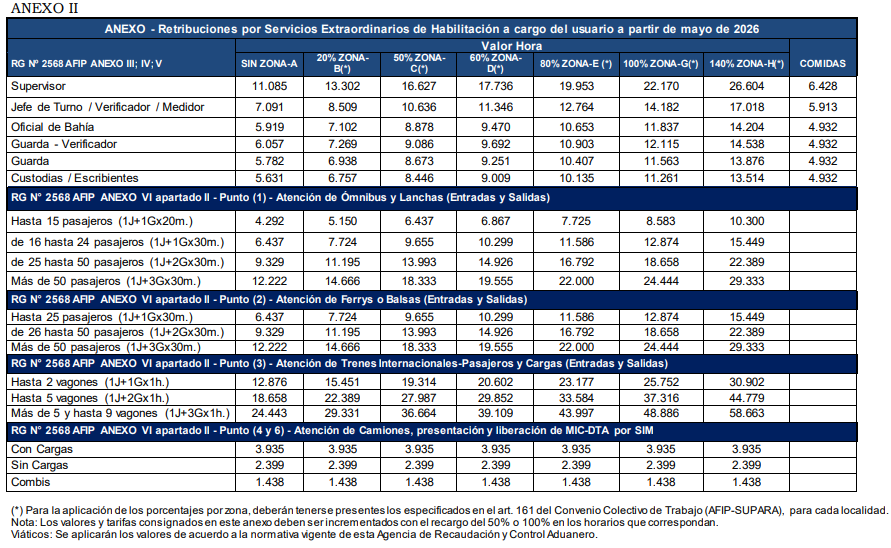Informamos que en el Boletín Oficial del día de la fecha (20/04/2026), se publicó la Resolución General N° 5834 mediante la cual la Agencia de Recaudación y Control Aduanero (ARCA) aprueba los nuevos cuadros tarifarios para las prestaciones que en carácter de servicios extraordinarios realice su personal a partir de HOY, lunes 20/04/2026.