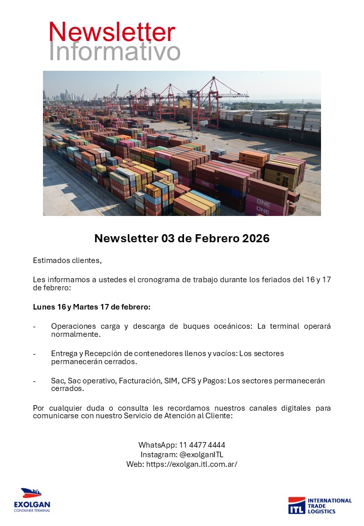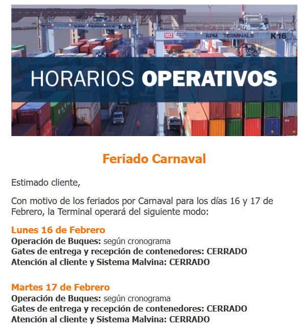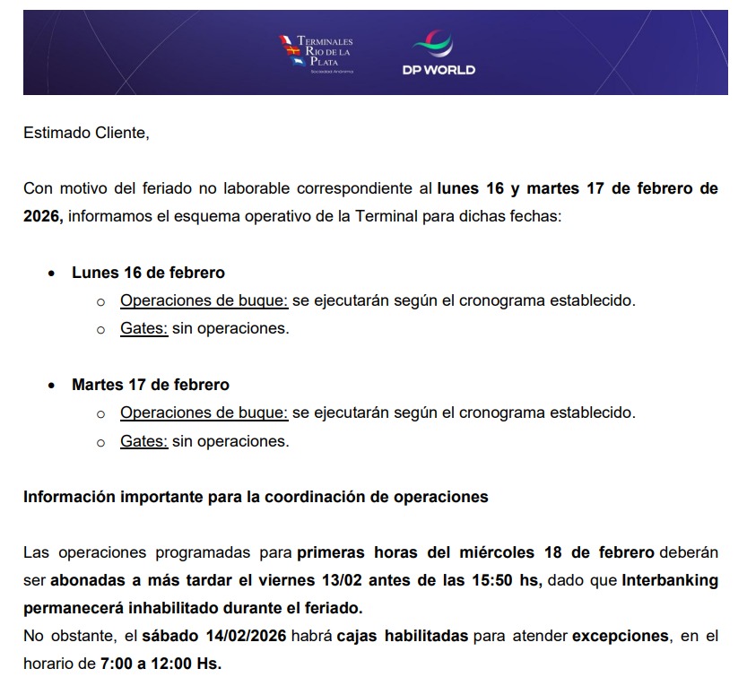 El Centro Despachantes de Aduana (CDA) les acerca a sus asociados el cronograma operativo de las distintas Terminales Portuarias para los feriados del carnaval de los días 16 y 17 de febrero de 2026.